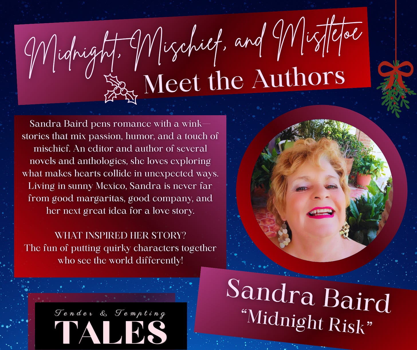 Sandra Baird pens romance with a wink—stories that mix passion, humor, and a touch of mischief. An editor and author of several novels and anthologies, including Tender and Tempting Tales, she loves exploring what makes hearts collide in unexpected ways. Living in sunny Mexico, Sandra is never far from good margaritas, good company, and her next great idea for a love story.